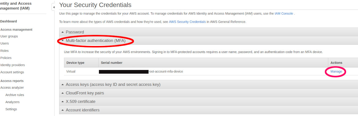 - Next click MANAGE to setup your virtual MFA device. Once your virtual MFA device can generate codes as shown you will be able to login with increased security.