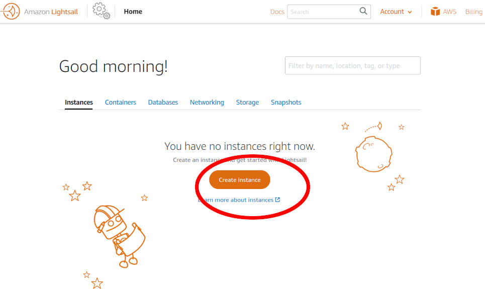 - Now do a service search and type in "Lightsail", when the Lightsail icon appears click it to start the setup of the next stage.