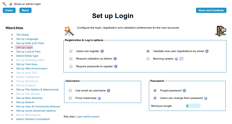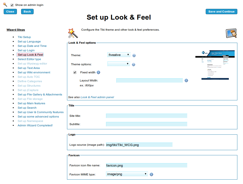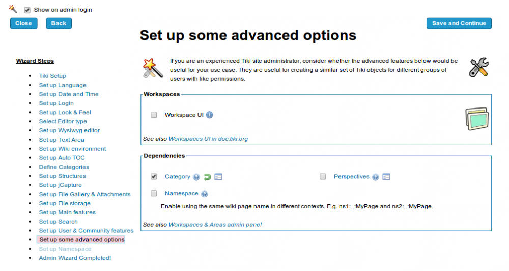 Starting in Tiki12, a wizard shows up for tiki admins when they first log in, enabling them to easily configure the main features of Tiki without the need to navigate through all admin panels. It was initially called "Admin Wizard", and renamed later to "Configuration Wizard"