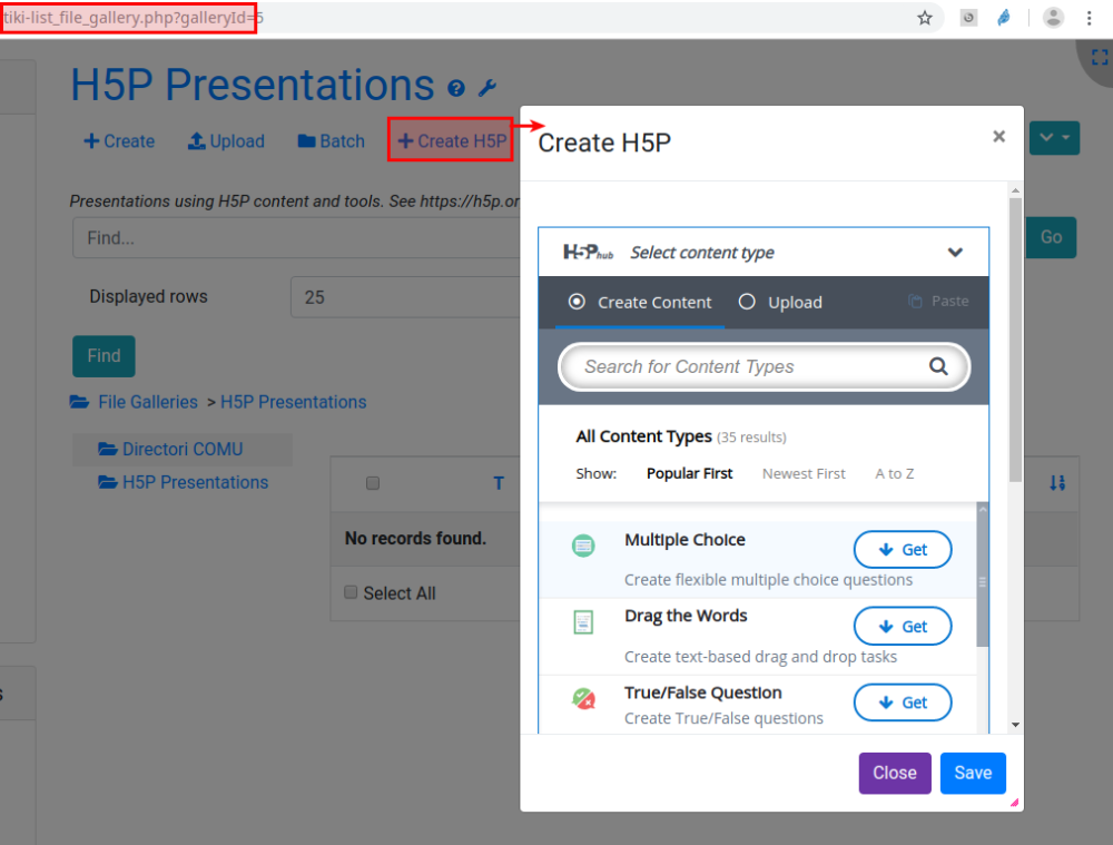 under the "Enhancements" tab and set H5P as its default file gallery. - Go to https://h5p.org/content-types-and-applications , browse, click on them to review and choose one content type. Since Tiki 19.1 you can also use the types offered directly while creating new H5P content in the File gallery thanks to the H5P Hub integration so you can skip the next 2 steps!