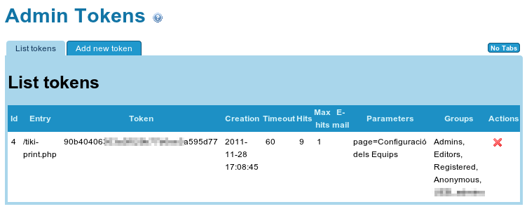 Moreover, Tiki9 brings an interface to manage tokens at (tiki-admin_tokens.php). For instance, if you have shared permissions to view some page with one friend, you would have one token generated for your page, which can be listed with this interface: