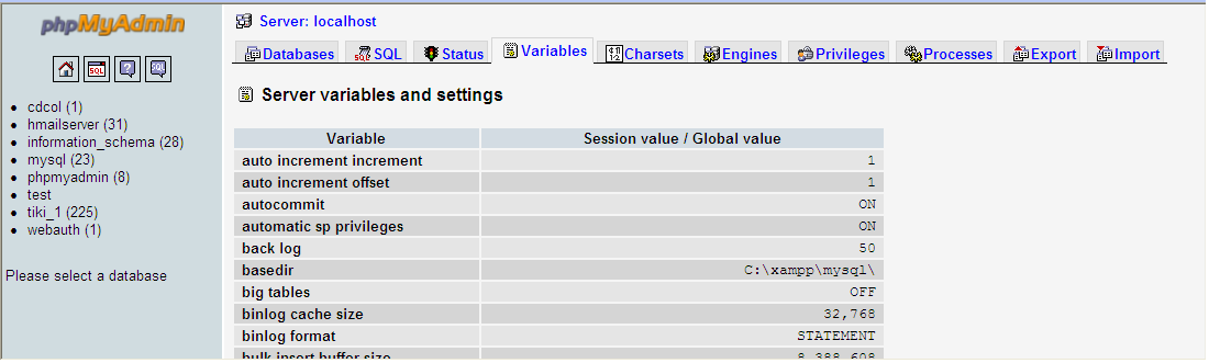 Select the "Variables" tab on the main phpMyAdmin screen. Scroll down until you find the