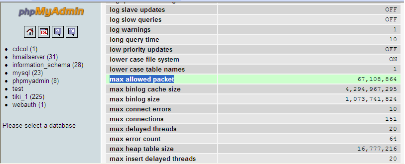 You can use the phpMyAdmin console to check the value of your "max_allowed_packet" variable.