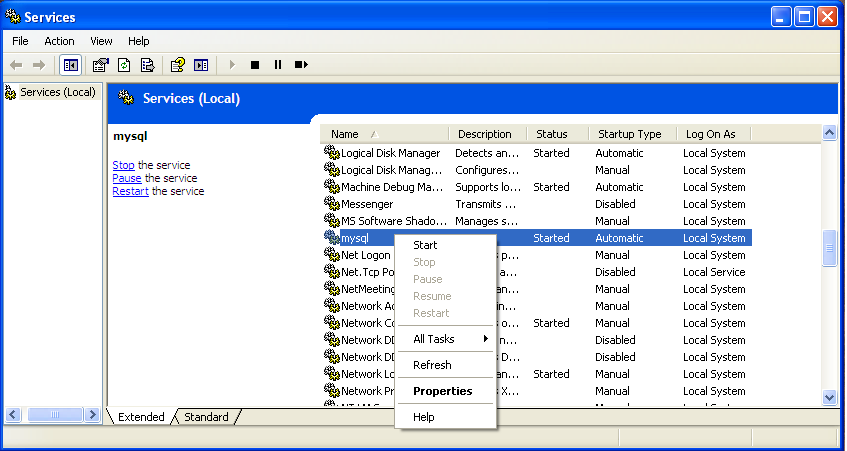 Again, on a typical Windows development box, you can locate your "mysql" service